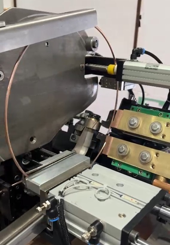 Automatic spot welding station joins cross wires instantly after bending.